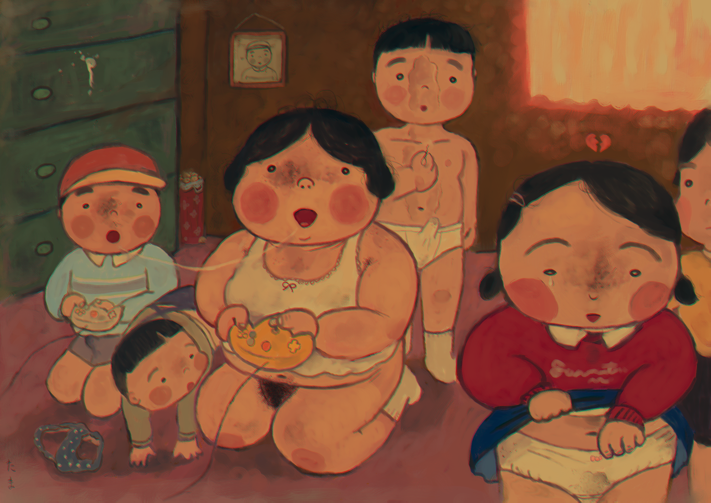 めぐちゃんのお部屋はかわいいピンクのじゅうたんがしかれていました。甘っぱくてちょっとくさいにおいもして、めぐちゃんはずーっとここでクリトリスをいじって過ごしているんだなぁと思っていたら、なんと、お部屋にテレビとゲームがありました!みんなでおかしを食べながらゲームをして遊びました。